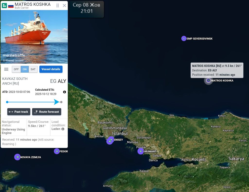 According to her, from October 3 to 7, the bulk carrier Matros Koshka (IMO:9550137) was loaded in occupied Sevastopol at the Avlita grain terminal.