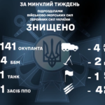 During the past week, Ukrainian Navy destroyed 141 invaders, 4 armored fighting vehicles, 1 tank, 1 air defense vehicle, 4 vehicles, 2 mortar positions, 1 control post, and 4 ammunition depots.